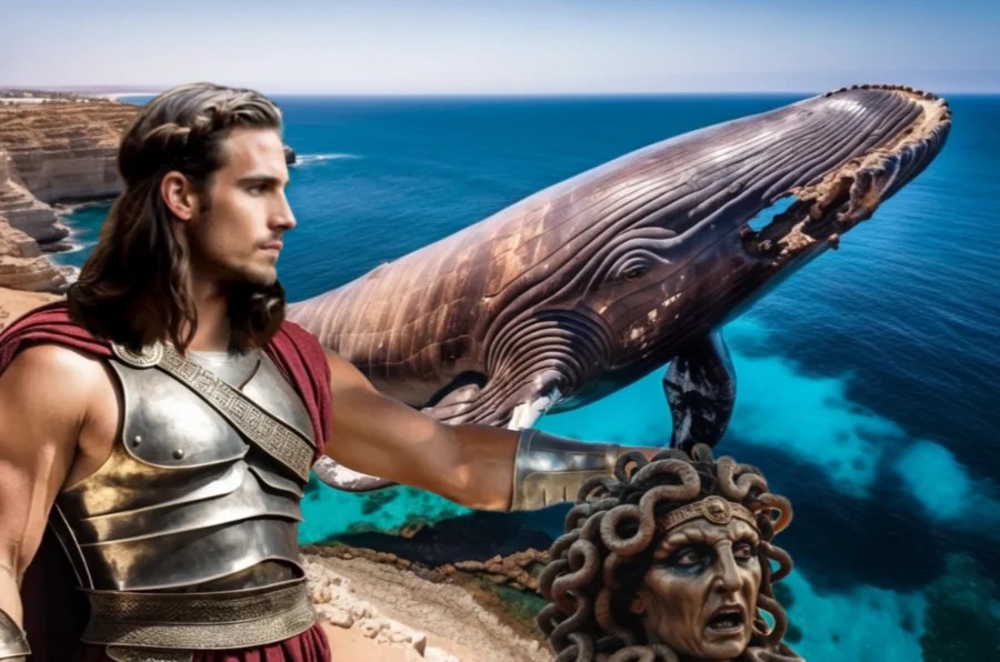 He was flying over the coast of Phoenicia, at that time part of ancient Aethiopia, when he noticed a huge whale in the shallows and a naked woman chained to the rocky shore. She was none other than Princess Andromeda, the daughter of King Cepheus, over whose kingdom he was flying. Her legendary beauty captivated him, and he instantly fell in love with her.