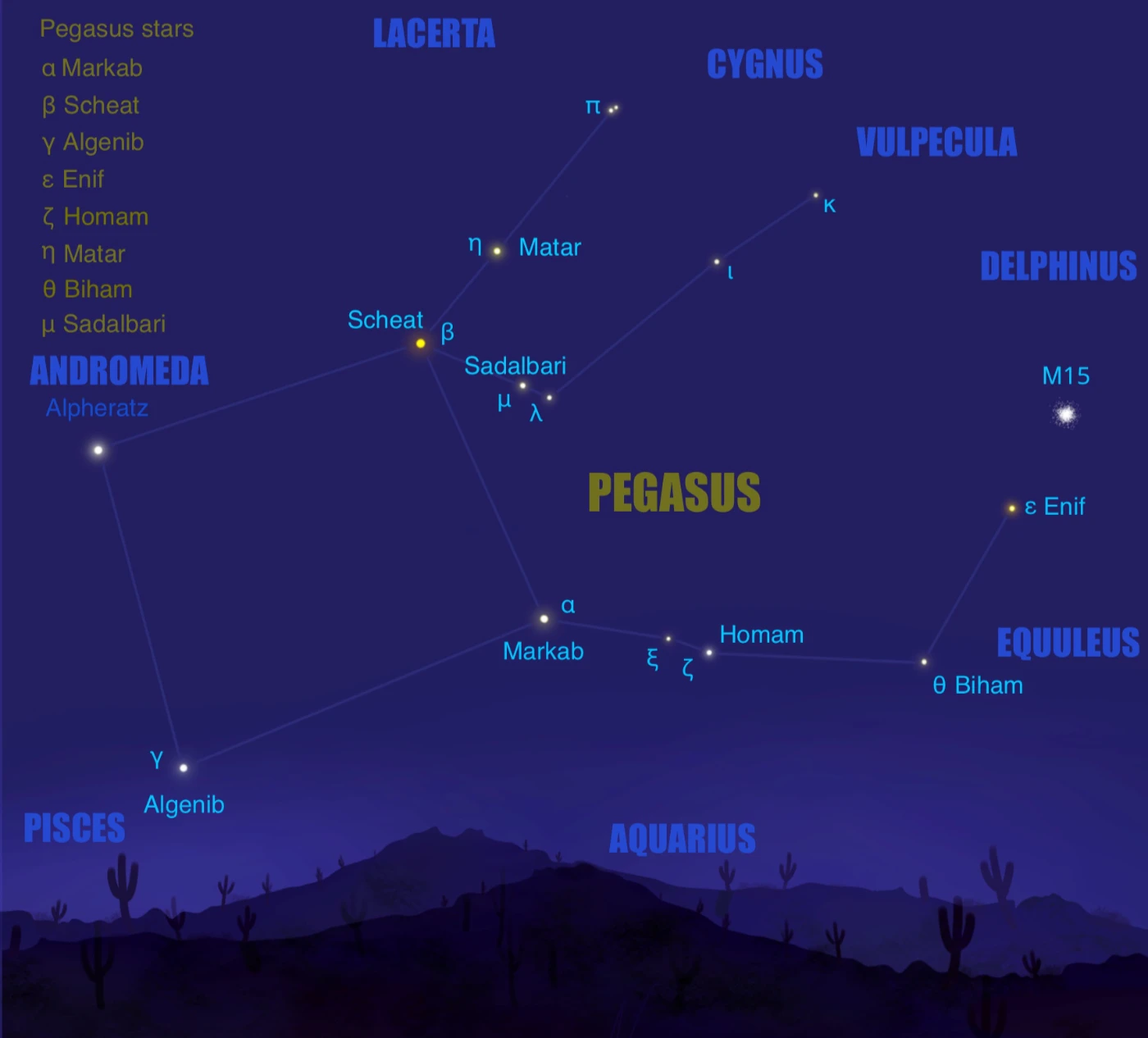 The constellation Pegasus, with its principal stars and adjacent constellations. The leftmost star, Alpheratz, is an integral part of the “square” of Pegasus but belongs to neighboring Andromeda. M15 is a globular star cluster. The size and brightness of stars and deep-sky objects have been increased for clarity.